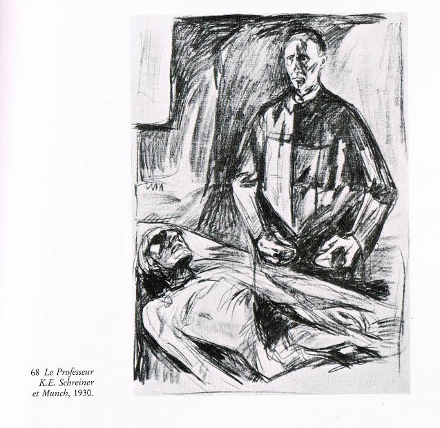 ‘Le professeur K.E. Schreiner, qui s’efforçait de guérir Munch de sa névrose et de ses insomnies, trouva en lui un patient extrêmement récalcitrant qui craignait de perdre son élan créateur – témoin un autoportrait, un dessin dans la tradition de la « Leçon d’anatomie », où il se représente allongé sur une table de dissection, la poitrine béante, face au docteur Schreiner. Sa force morale est évidente ici : qui, osant regarder la réalité en face, a le courage, en outre, de la représenter aussi crûment ?’